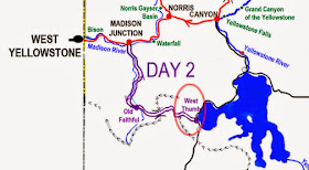 Travel from the Upper Basin (the home of Old Faithful) to Yellowstone Lake (cross the Continental Divide - not only once but twice: that is the funny black line on the map).